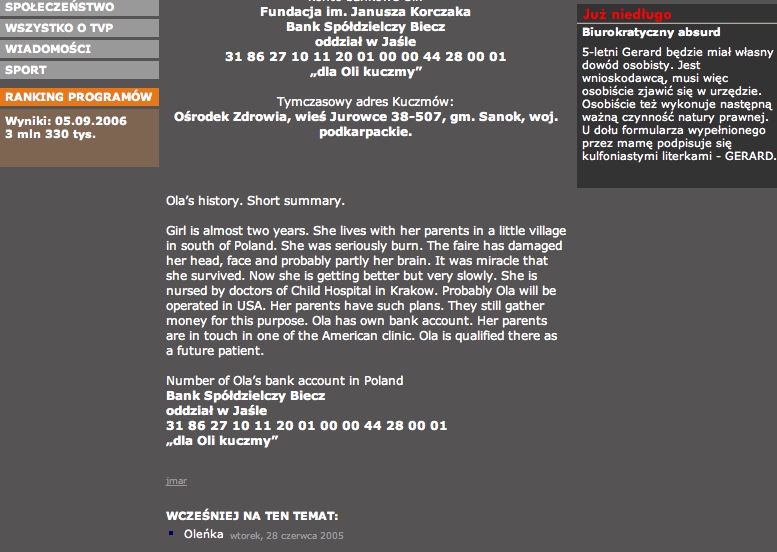 La bambina ha quasi due anni. Vive con i propri genitori in un paesino nel sud della Polonia. Ha subito delle ustioni gravi. Il fuoco le ha danneggiato la testa, il viso e probabilmente parte del cervello. E' un miracolo che sia sopravvissuta. Ora sta migliorando, ma molto lentamente. Si occupano di lei i medici dell'Ospedale Pediatrico di Cracovia. Probabilmente Ola subirà un intervento negli Stati Uniti; è questo che intendono fare i suoi genitori. Stanno tuttora raccogliendo fondi a questo scopo. Ola ha un proprio conto bancario. I suoi genitori sono in contatto con una clinica statunitense, presso la quale Ola è qualificata [sic] come futura paziente.