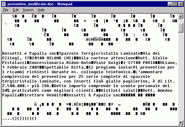 Infatti se il destinatario apre il file usando il Blocco Note (operazione banalissima), come potete fare voi stessi se scaricate il file, vi troverete dentro il testo integrale del preventivo precedente, che rivela completamente il raggiro che la Rossetti & Papalia sta cercando di perpetrare ai danni della DePravato srl.